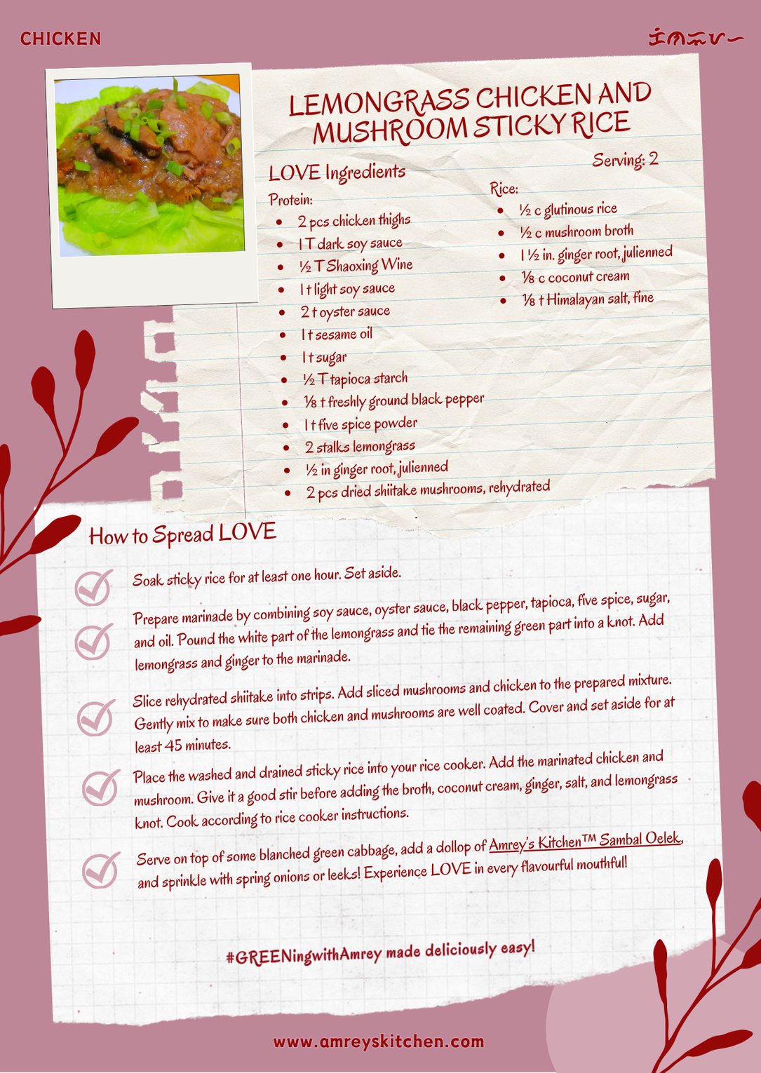 I wanted some greens to go along with this so I decided to serve it on top of a few blanched green cabbage leaves and topped it with leeks. A dollop of Amrey’s Kitchen™ Sambal Oelek adds the right amount of heat too.