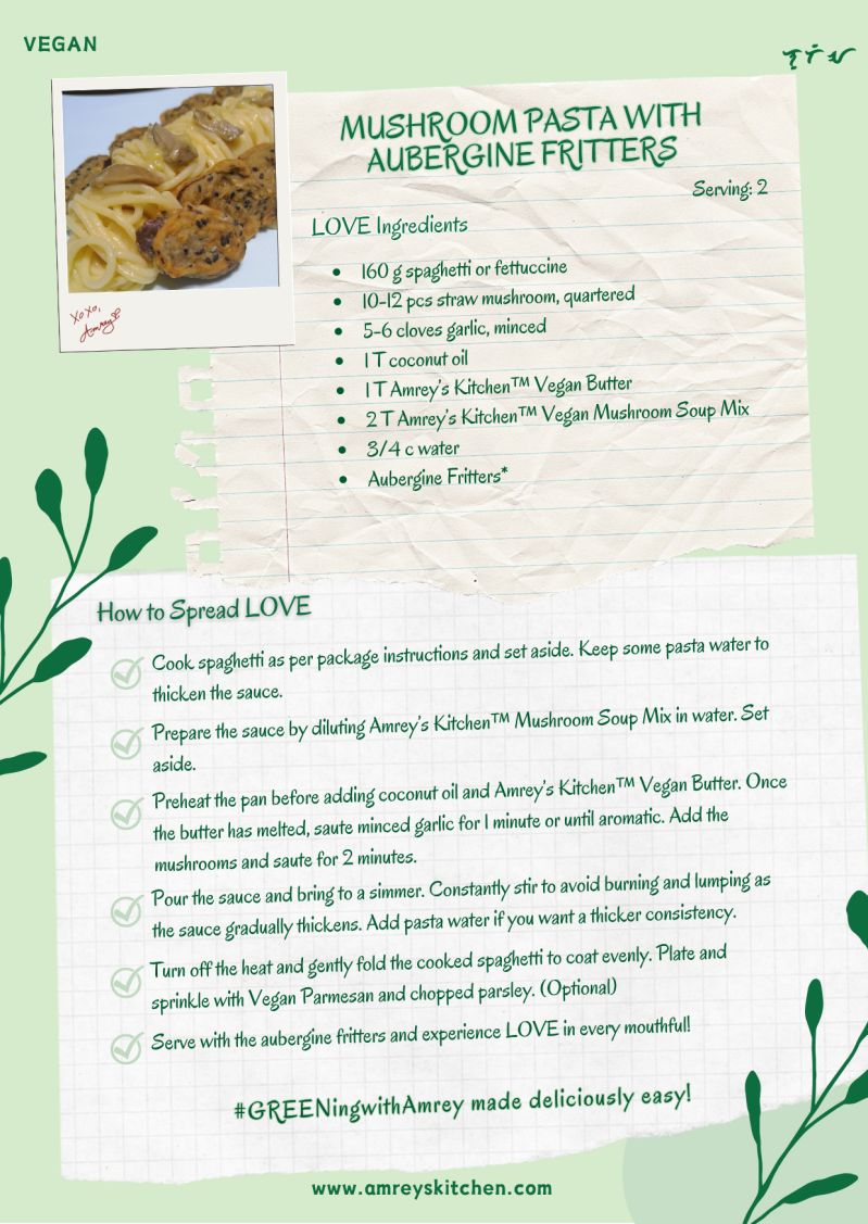 Share photos of your version of this Vegan Mushroom Pasta with Aubergine Fritters on IG @amreyskitchen (#amreyskitchen #amapolism #katutubo101 #BaybayinPoatHindiAlibata #mindfuleating). Remember, sharing is loving. Let’s keep spreading LOVE with Amrey’s Kitchen™ mindfully crafted creations and recipes!